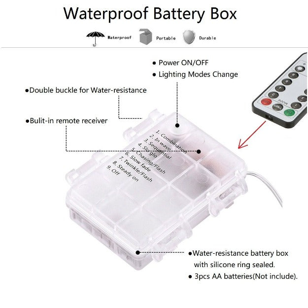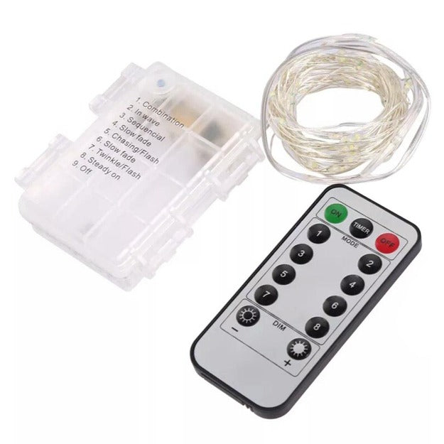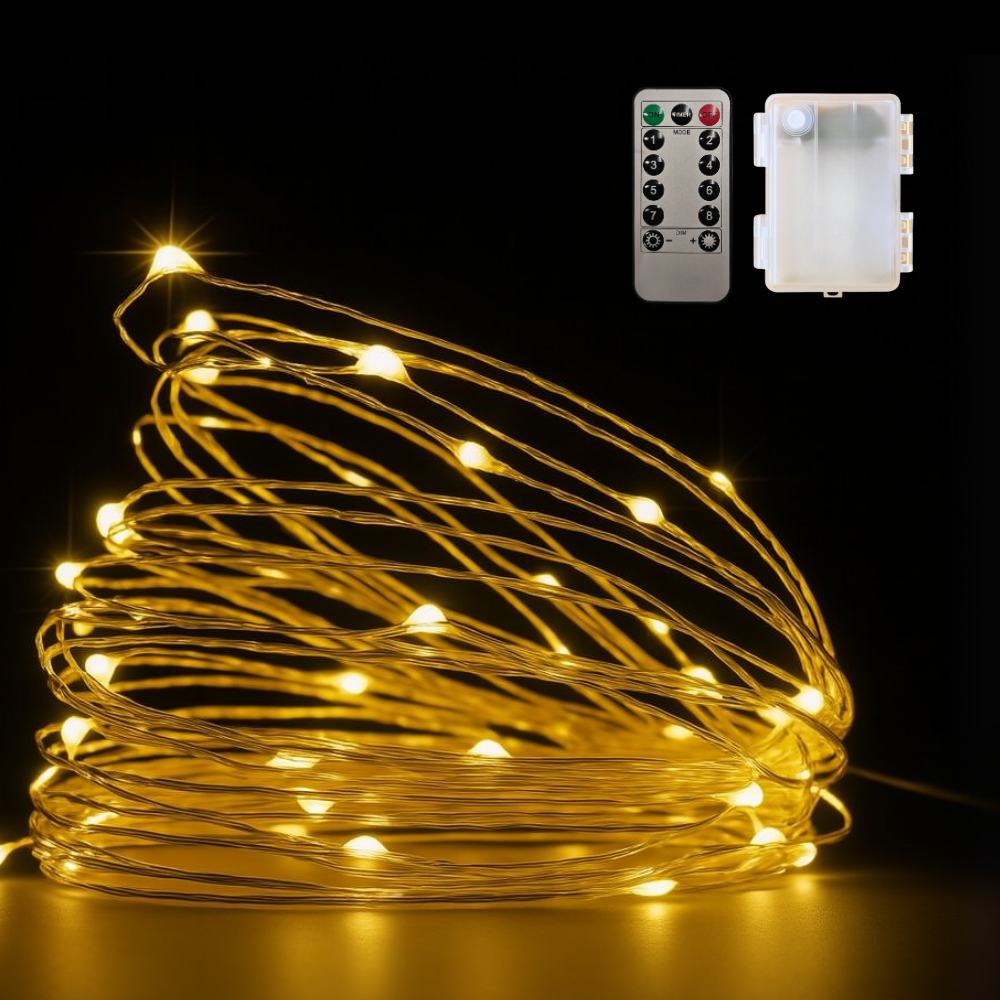Copper Wire Fairy LED String Lights - 3AA Battery Operated | 8 Function Remote Control | IP44 Waterproof | Warm White