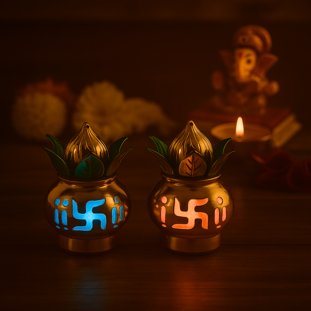 LED Kalash with Meena Leaf Table Lamp (Pack of 2) | Divine Glow for Your Pooja Mandir & Home Décor