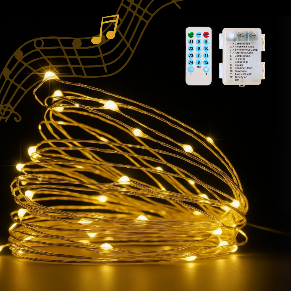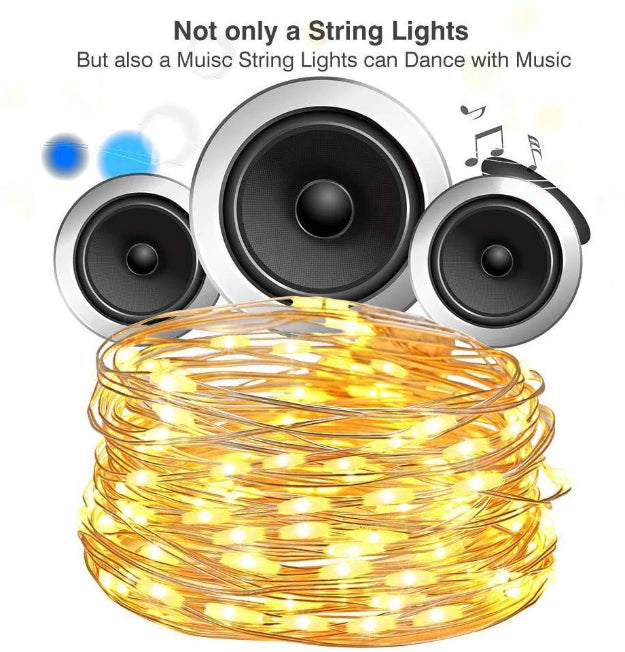 Music Beats Sync Copper Wire Fairy LED String Lights - 3AA Battery Operated | 12 Function Remote Control | IP44 Waterproof | Warm White